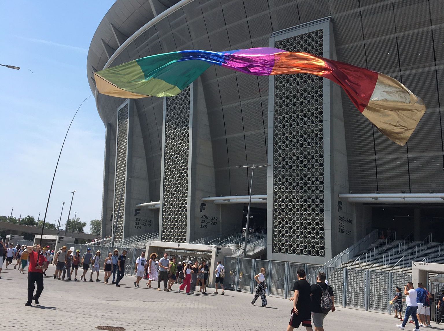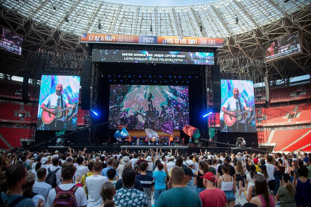 At the start of the event, we welcomed people to the stadium with praise. We spent some time prophetically opening the gates of worship, standing on the grass between the sports arena (where previous “Ez Az A Nap” worship events have taken place) and the football stadium (this event), and moving with colourful flags near a band who were playing familiar Christian songs in Hungarian.