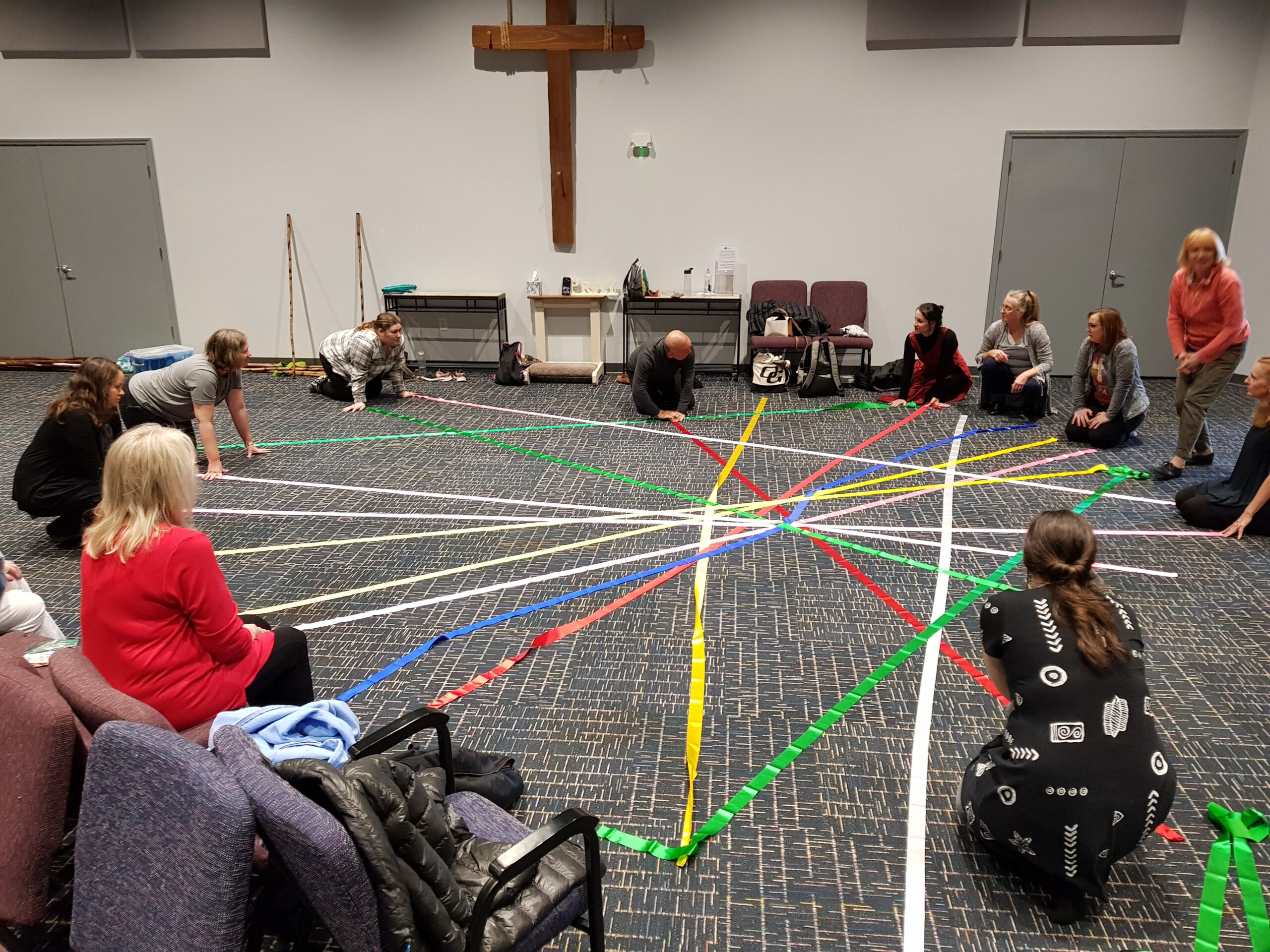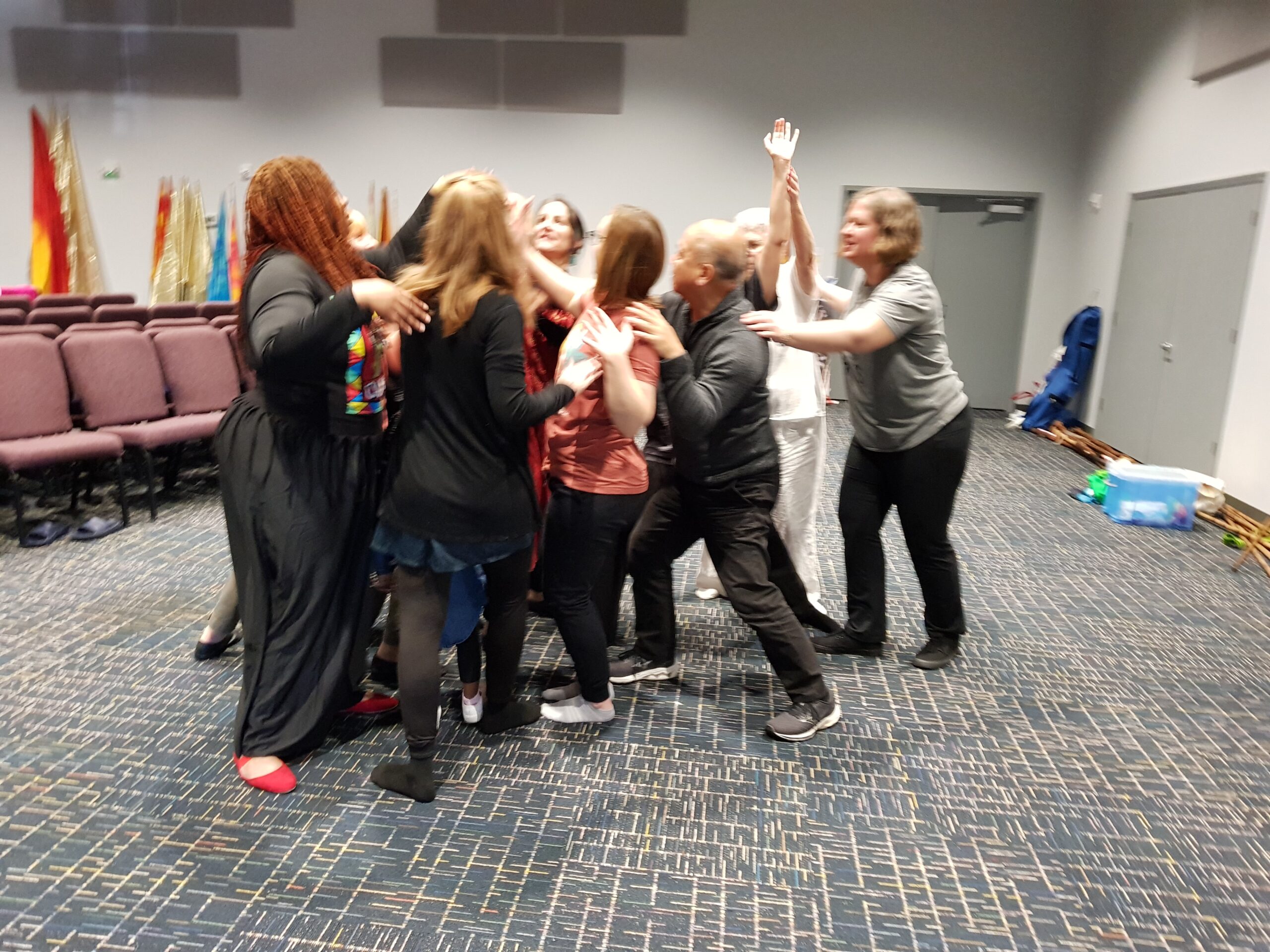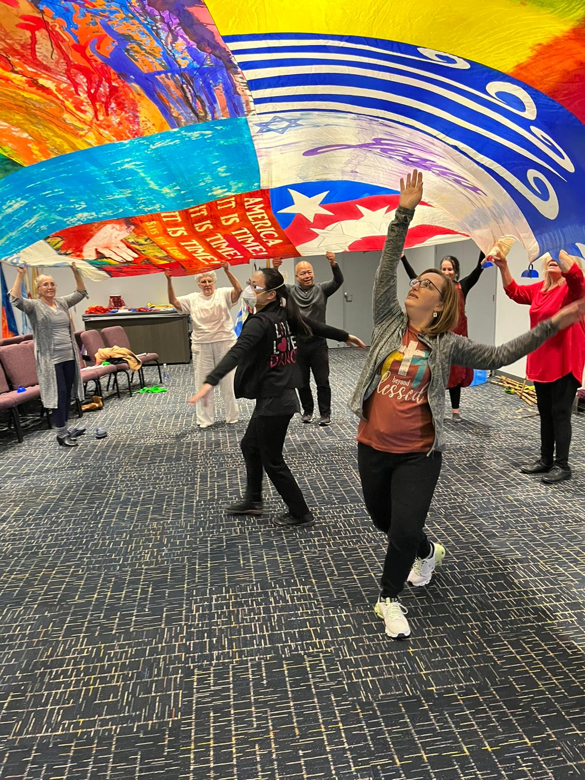 On Saturday, the Tribe weekenders were blessed by Mosaic Church, who were so welcoming, that even their sound tech joined in. There couldn’t have been a better venue or atmosphere. We started with a refresh on UMV (unique movement vocabulary) and DMS (dynamic mass sculpture) as taught on the Creative Movement Workshop. This kicked off an amazing time with a variety of aspects including moving with a massive parachute-like banner with cow bells, streamers, and moving in all types of ways.